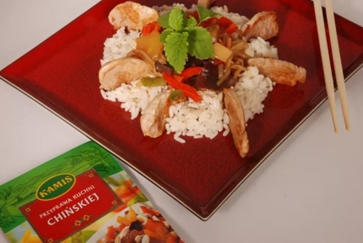 Polędwiczkę pokroić w plastry, oprószyć Przyprawą Kuchni Chińskiej, obsmażyć w rondlu, dodać pokrojoną w piórka cebulę, paski papryki, pędy bambusa i fasoli, kawałki ananasa, obgotowane grzyby mun, wlać sos sojowy, olej sezamowy, dodać ponownie łyżkę Przyprawy Kuchni Chińskiej, podlać wodą i dusić kilkanaście minut. Pod koniec lekko zagęścić skrobią, doprawić solą i pieprzem. Podawać z ryżem.