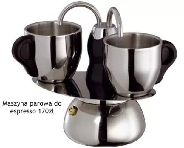 Maszyna parowa do espresso. Wykonana ze stali nierdzewnej. Nalewamy wody, nasypujemy kawę do specjalnego czajniczka, stawiamy na palniku i czekamy chwilkę aż z dysz popłynie aromatyczny napój. Kliknij i zobacz: maszyna parowa