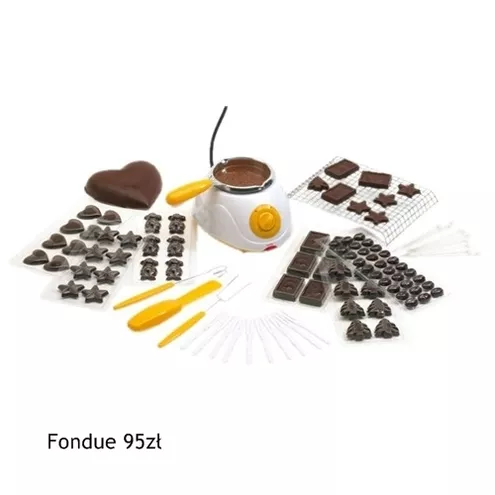 Zestaw do fondue. Najpierw przygotowujemy owoce- mogą to być truskawki, pomarańcze, melon, banany, arbuz, maliny i wszystkie, jakie przyjdą nam do głowy. W pojemniczku umieszczamy po trochu z każdego rodzaju czekolady: gorzką, mleczną i białą. Dolewamy odrobinę skondensowanego mleka (bez cukru) i mieszając czekamy aż się rozpuści. Na widelczyk nadziewamy ulubiony owoc, zanurzamy w płynnej czekoladzie i czym prędzej umieszczamy w ustach! Mmmmmm... Prawda, że pyszne? Kliknij i zobacz: fondue