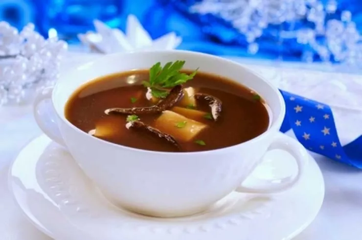 Grzyby namoczyć w szklance wody, następnie ugotować w wodzie, w której się moczyły dodając warzywa. Grzyby wyjąć, pokroić w paseczki. Wywar uzupełnić wodą, wrzucić kostki bulionowe. Zagotować, doprawić Maggi i pieprzem. Dodać natkę pietruszki. Podawać z łazankami.