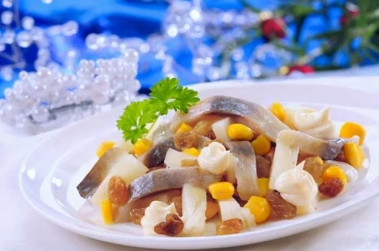 Filety śledziowe moczyć przez około 60 minut, odsączyć i pokroić w paseczki, skropić sokiem z cytryny i pozostawić na 30 minut. Kukurydzę i ananasy odsączyć. Ananasy pokroić w paseczki. Rodzynki umyć i sparzyć wrzątkiem. Połączyć wszystkie składniki z Majonezem. Doprawić pieprzem.