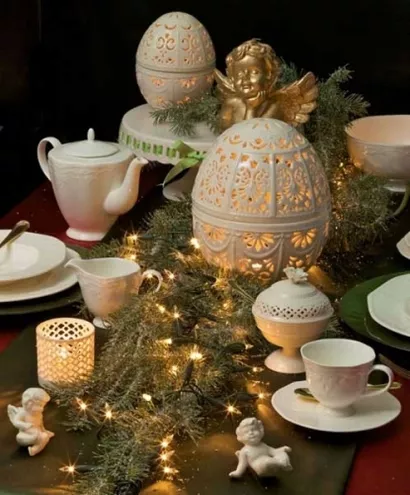 Dla osób ceniących klasyczną elegancję, marka Villa Italia proponuje zestawienie tradycyjnej, kremowo-białej porcelany ze świątecznymi dodatkami w tym samym odcieniu. Wybierz zestaw z kolekcji Retro marki Villa Italia. Ceramiczne naczynia w subtelnym odcieniu kości słoniowej, wyróżniają się klasycznym kształtem i ciekawym zdobieniem. Wyjątkowo dekoracyjne są talerzyki deserowe z pięknym roślinnym motywem na całej powierzchni. Z zastawą Retro będą się ciekawie komponować dodatki z kolekcji Clara marki Villa Italia. Możesz wybrać ażurowe osłonki na świece, figurki w kształcie aniołków czy stylowe lampiony ozdobione ażurowym motywem. Biel zastawy i dodatków pięknie przełamiesz używając barwnego bieżnika, np. w kolorze zieleni. Stół warto ozdobić świeżymi gałązkami jałowca lub świerku, które nadadzą wnętrzu przyjemny, świąteczny aromat.