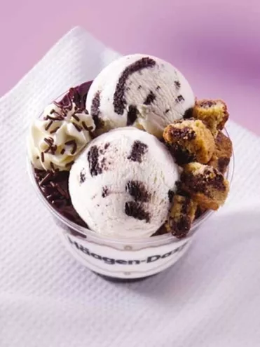 Lody Häagen-Dazs Cookies & Cream ułóż w pucharku na lody. Następnie część ciasteczek pokrusz na drobne kawałki i posyp nimi lody. Dodaj polewę karmelową. Zetrzyj na drobnej tarce kostki czekolady i posyp deser wiórkami. Całość udekoruj bitą śmietaną, możesz także obłożyć deser pozostałymi ciasteczkami.