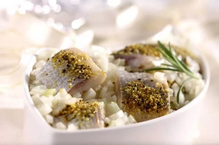 Filety wymoczyć w zimnej wodzie (przez ok. 1 godzinę). Następnie pokroić w romby o długości ok. 5 cm. Cebule drobno posiekać, przelać na sicie wrzątkiem, ostudzić. W naczyniu ułożyć na przemian śledzie posypane pieprzem cytrynowym i cebulę. Zalać olejem. Odstawić w chłodne miejsce na min. 24 godziny.