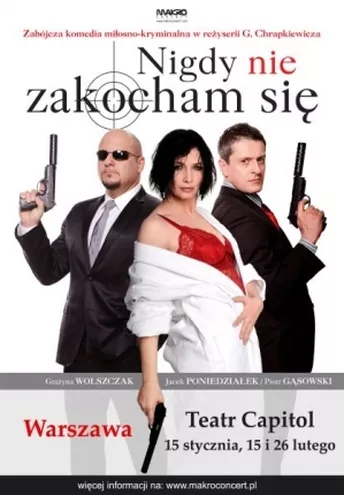 Nigdy Nie Zakocham się to świetna miłosno – kryminalna komedia autorstwa Cezarego Harasimowicza. Pełna pomyłek i zaskakujących zwrotów akcji, gdzie spryt miesza się z naiwnością, a pożądanie z nienawiścią. Z londyńskiej galerii ginie słynny 46 karatowy brylant „Grot Kupidyna” warty 2 miliony funtów. Policja rozpoczyna śledztwo w tej sprawie. W hotelowym pokoju nr 21 (przypadkiem?) spotyka się Diana – kobieta z przeszłością i Ernest – mężczyzna po przejściach. Z czasem okazuje się, że obydwoje mają coś wspólnego z zaginionym brylantem. Na pozór przypadkowa znajomość wyjawia wyrafinowanie i przebiegłość bohaterów. Zagmatwana sytuacja komplikuje się jeszcze bardziej kiedy między Dianą a Ernestem rodzi się uczucie.