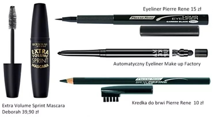 Jako dodatek pamiętajmy o ciekawej kresce typu smokey eyes. Zamiast tradycyjnego eyelinera możemy zdecydować się na użycie pisaka np. Pierre Rene, który umożliwia codzienne szybkie i precyzyjne wykonanie kreski. Pozwala on sprawnie wykonać idealny rysunek oka. Jest to dobra alternatywa dla początkujących – dla ułatwienia wykonania makijażu nanosimy kilka kropeczek wzdłuż linii rzęs i łączymy kreską. Efekt dopełni pogrubiająca mascara. Kolejno możesz podkreślić kredką rysunek brwi, a następnie ułożyć je szczoteczką.