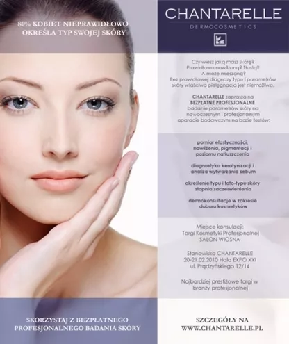 Aby skóra promieniała, była zdrowa i piękna potrzebna jest profesjonalna konsultacja kosmetologiczna, dlatego firma Chantarelle postanowiła zorganizować bezpłatny program pomiarowy „Poznaj swoją skórę”. Pomiar parametrów za pomocą specjalnej ultraczułej głowicy umożliwia zrozumienie potrzeb swojej cery, określenie jej rodzaju i specyfiki oraz zapoznanie się z podstawowymi zasadami odpowiedniej pielęgnacji skóry oraz profilaktyki przed chorobami skóry.