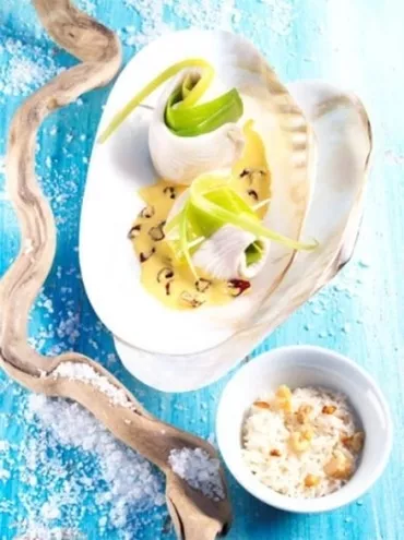 Roladki z soli i pora w sosie szafranowo-żurawinowym