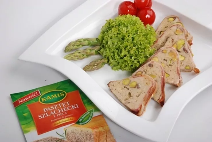 Wątróbkę z cebulą podsmażyć, dodać mięso królika, liście laurowe oraz ziele angielskie. Podlać wodą i dusić około 40 minut. Pod koniec dodać bułkę i wystudzić. Całość zmielić 2-3 razy, dodać jaja, przyprawę Pasztet szlachecki z pieca, pistacje, dokładnie wymieszać. Zamrożoną słoninę pokroić w bardzo cienkie plastry, wyłożyć nimi formę do pasztetu, dodać masę, dokładnie ubić. Piec około 50 minut w temp. 170 st.