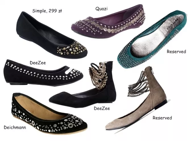 Co roku mamy coraz więcej unowocześnionych wersji klasycznych balerinek. Oprócz tych tradycyjnych, gładkich i na płaskiej podeszwie coraz częściej spotykamy baleriny obite ćwiekami czy różnorodnymi błyskotkami. Tego typu buty możemy ubrać nawet do elganckiego stroju.