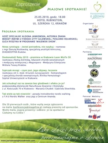 Również podczas majowego spotkania zostaną poruszone ważne tematy z zakresu zdrowia - przede wszystkim z dziedziny diagnostyki laboratoryjnej oraz medycyny estetycznej. Nie zabraknie również cennych porad żywieniowych oraz zdrowych sposobów na uzyskanie tak pożądanej w okresie wiosny i lata idealnej figury. Ich dopełnieniem staną się wskazówki wykwalifikowanych instruktorów jogi oraz nordic walking. Rozmowy przy lampce wina uświetni obecność gościa specjalnego debaty, którym będzie Aldona Jankowska, doskonale znana widzom programu „Majewski Show” z parodii posłanki Danuty Hojarskiej oraz Ojca Rydzyka. Gwarantujemy doskonałą atmosferę oraz możliwość wylosowania wielu atrakcyjnych nagród.