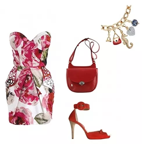 sukienka Lipsy 320 zł, torebka Wojewodzic, sandały Simple 469 zł, złote charmsy Yes