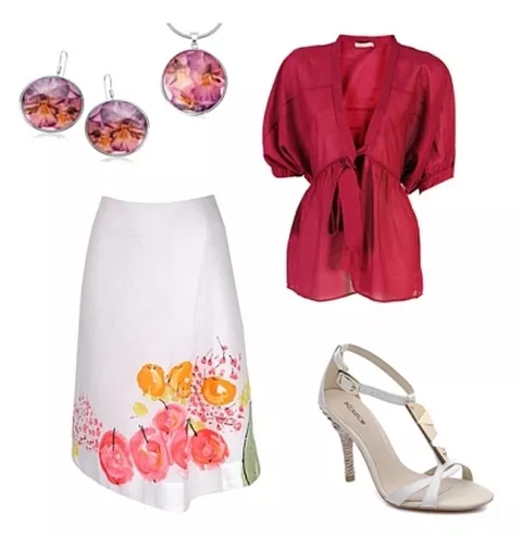 naszyjnik i kolczyki Yes, bluzka Stefanel 270 zł, spódnica Solar 279 zł, sandały Kazar 429 zł