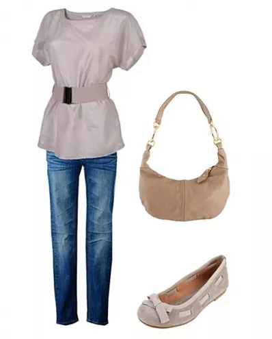 tunika Top Secret 99,90 zł, dżinsy Orsay 139,90 zł, baleriny Prima Moda 189 zł, torebka Prima Moda 199 zł