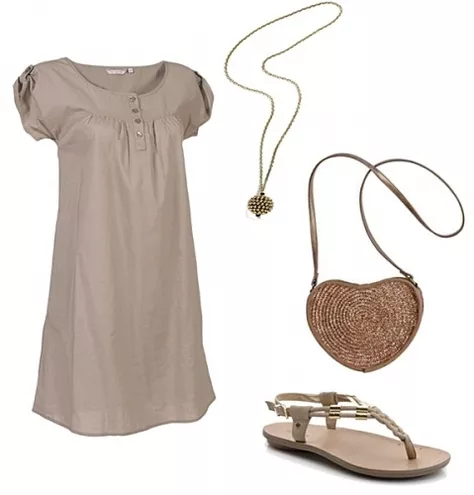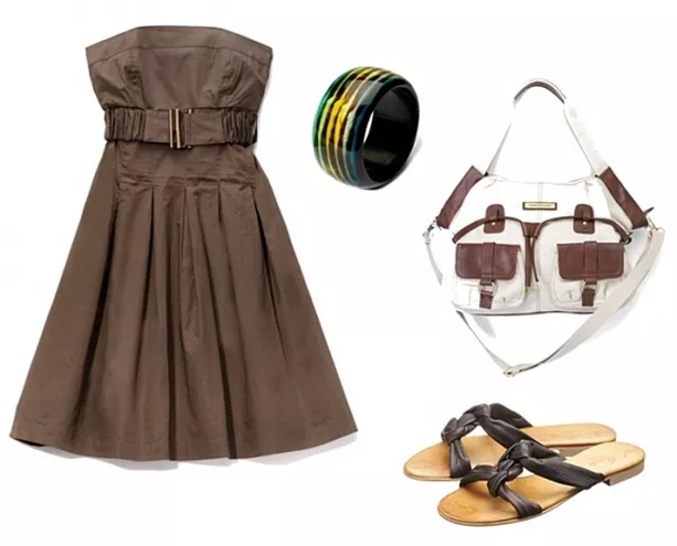 sukienka Strativarius 159 zł, torebka JohnDoe.pl, bransoletki Cocayo 39,99 zł i 49,99 zł, sandały Heavy Duty 179 zł