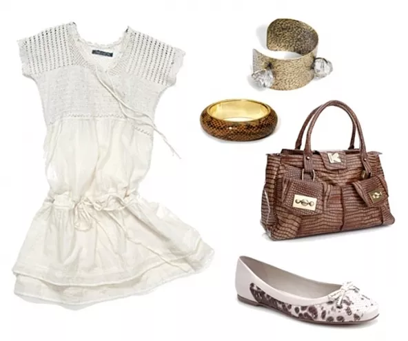 sukienka Zara, baleriny Kazar 369 zł, bransoletka złota C&A 55 zł, brązowa bransoletka Reserved, torebka Kazar 899 zł