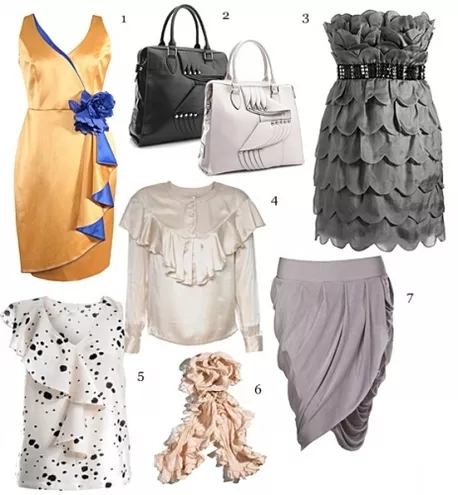 1.sukienka Modesta 380 zł, 2. torebki Kazar 699 zł, 3. sukienka Lipsy 800 zł, 4. koszula H&M 179 zł, 5. tunika H&M 99 zł, 6. szal H&M, 7. spódnica Gatta 199,90 zł