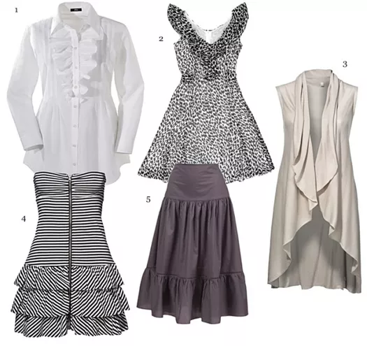 1.koszula s.Oliver, 2. sukienka Taranko 299 zł, 3. kardigan Amisu 99,95 zł, 4. sukienka Fishbone 69,95 zł, 5. spódnica Top Secret