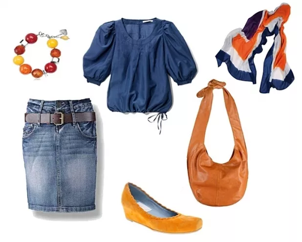 spódnica Orsay 99,90 zł, bluzka Reserved 99,90 zł, chusta Ravel, bransoletka Yes, torebka Prima Moda 299 zł, buty Gino Rossi 299 zł