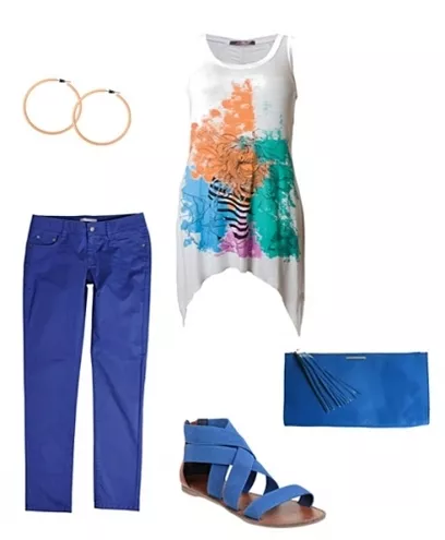 spodnie Stefanel 239 zł, bluzka Troll, torebka Simple 400 zł, sandały Quazi 99 zł, kolczyki Cubus