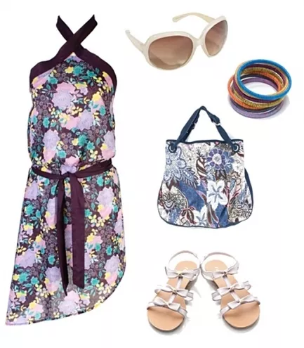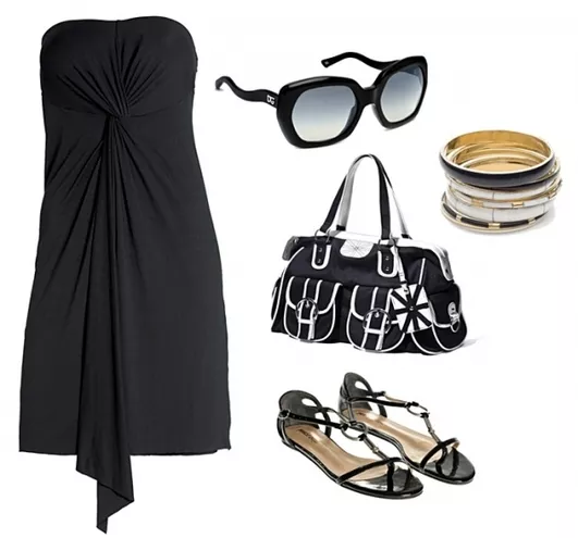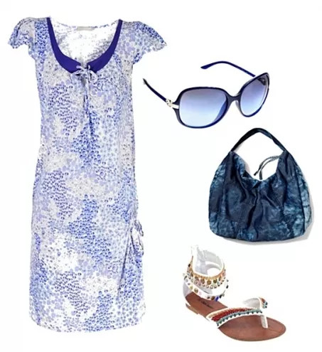 sukienka Stefanel 315 zł, torebka Reserved 99,90 zł, sandały CCC 59,90 zł, okulary Ralph Lauren