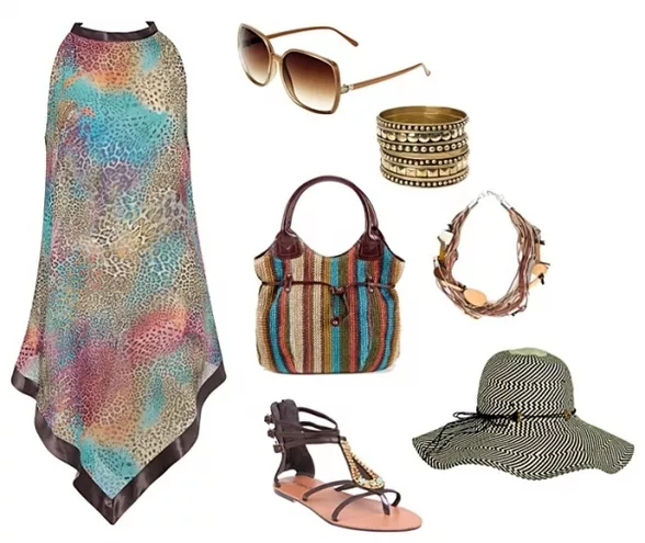 tunika Calzedonia, torebka Wittchen 139 zł, naszyjnik Zielony Kot 99,90 zł, bransoletka Zielony Kot 53 zł, sandały Quazi 119 zł, okulary H&M, kapelusz Orsay 59,90 zł
