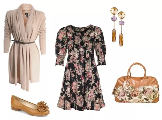 cardigan H&M 129 zł, sukienka KappAhl, torebka BGN, baleriny Salamader 1250 zł, kolczyki W. Kruk
