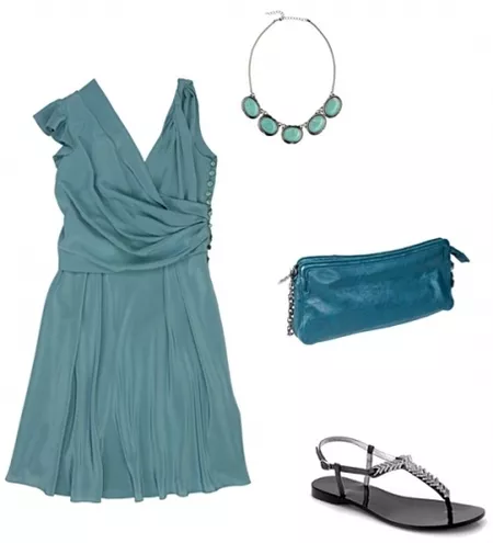 sukienka BGN, naszyjnik Cocayo 69,99 zł, sandały Kazar 249 zł, kopertówka Stefanel