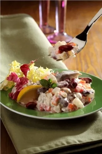 Do sałatki pasuje żytni chleb, a najlepiej domowy, kaszubski, wypiekany z żytniej mąki z dodatkiem roztartych ziemniaków.